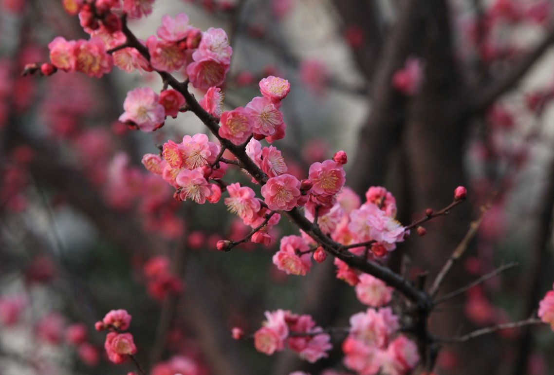 开州区盛山植物园大片红梅花也在迎春怒放,一朵朵红梅傲立枝头,灿若云霞,火红的花色带着春天浓烈的气息扑面而来,朵朵红梅翘首枝头,散发出阵阵暗香,市民们漫步花丛,观景赏春,十分惬意。