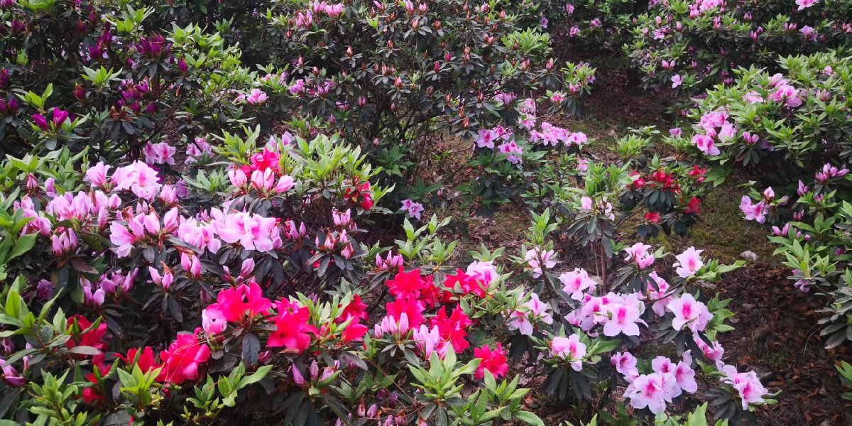 沿着石板小道一路深入,两旁娇花环绕,更远处,已模模糊糊窥见半分杜鹃春色。