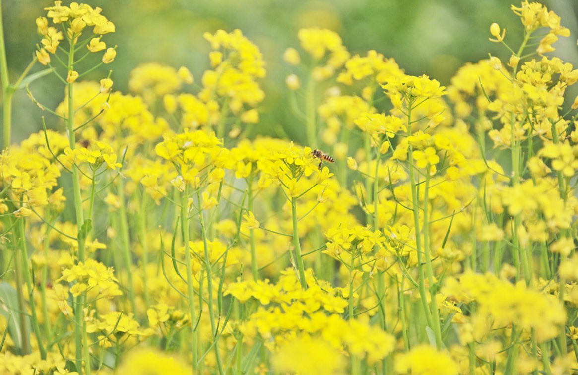 漫步花海,一朵朵油菜花迎风摇曳,蜜蜂忙着嬉戏采蜜,不少游客前来赏花游玩,尽情享受油菜花盛开带来的喜悦。