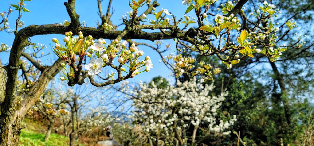 朵朵开放的梨花缀满枝头,如朵朵白云坠落人间。在这里,万亩梨花环山也环人,犀牛阁、望牛亭、北丛林木屋被梨花掩映其中,更是一番自然静谧之味,放牛坪的建筑也迎来了这一份的旖旎春色。