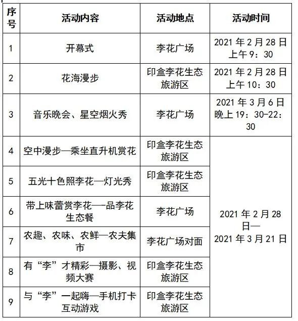 跟往年不同的是,今年印盒李花节的夜间活动也是丰富多彩,主办方特别定制了多组彩灯和节日礼花,并将举办一场大型的星空音乐晚会,让市民在白天尽情欣赏美景之后,晚上也能欣赏到五光十色的灯光秀、烟花秀、听着摇滚乐酣唱夜空,度过一个轻松愉快的周末。