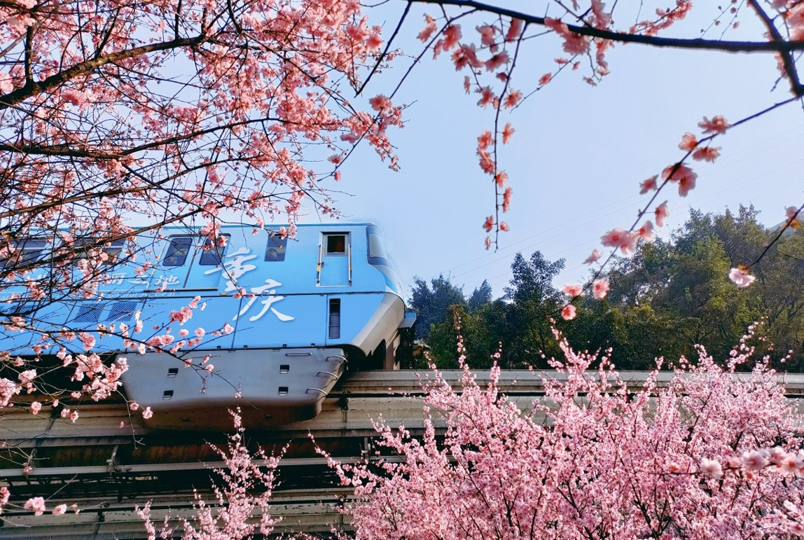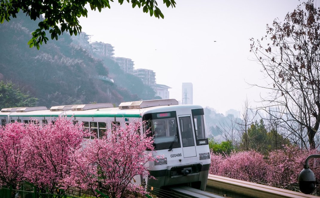 近日,重庆轨道交通2号线佛图关段,大面积的美人梅花盛开,列车穿行在花海中,如开往春天的列车。