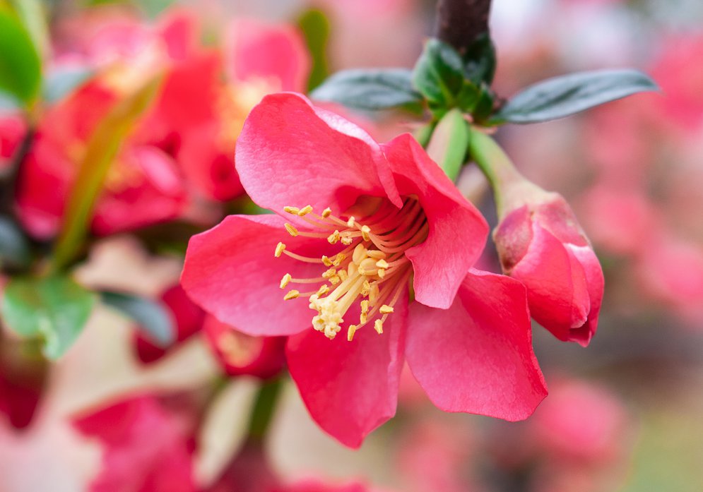 大足素有“海棠香国”的美誉,大足的“区花”贴梗海棠已经盛开,火红的海棠迎春绽放,热情似火;再过一段时间,到了3月,待到垂丝海棠、北美海棠花开,花下俯仰,林间漫步,闻海棠香浓。
