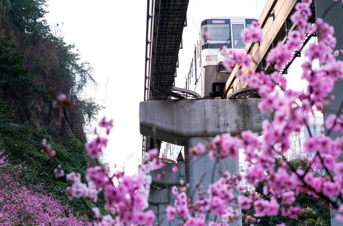 近日,重庆轨道交通2号线佛图关段,大面积的美人梅花盛开,列车穿行在花海中,如开往春天的列车。