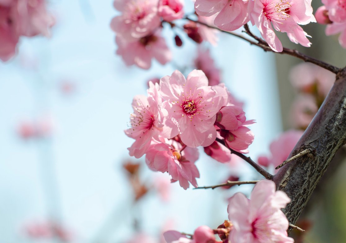 置身于盛开的美人梅花中,身后有行驶而过的列车,加上晴好的天气,这般春天气象一切都是那么的惬意美好。这里的美人梅的花期也将持续近一个月。
