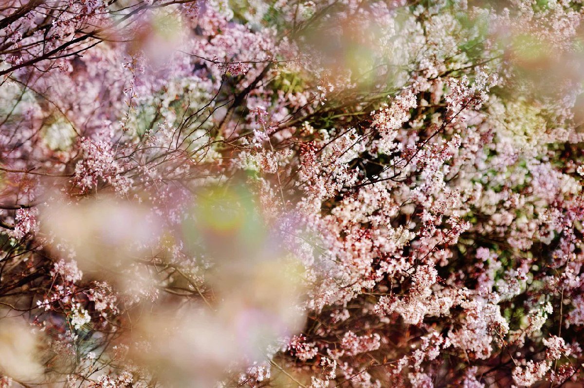 这里数万株迎春盛放的野樱花,连绵数里,放眼眺望,远山含黛,密密匝匝开满枝头,一个山头连着一个山头。