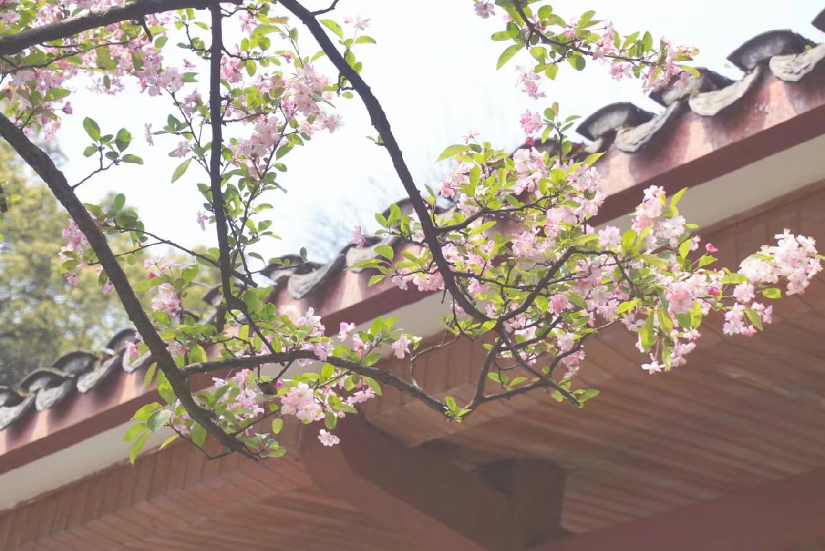 现在园内早樱盛开,绘绝了春色,占尽了春光。粉色的花瓣上点缀着颗颗露珠,让人心旷神怡。