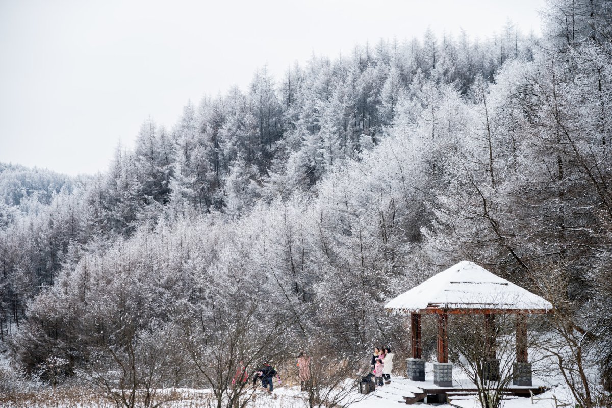 难得一见的雾凇给山峰上的树木、岩石、屋舍全部披上了一层晶莹的薄衣,白雪压青松,青松挺且直 ,而当雾凇降临时,苍劲的古松犹如盛开的菊花,点缀于千姿百态的奇峰异石上,那种美已是不可言表。