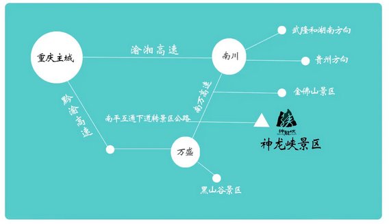 重庆市内环界石收费站―(渝湘高速公路G65)―南万高速(万盛方向)—南平收费站(左转国道)—神龙峡景区