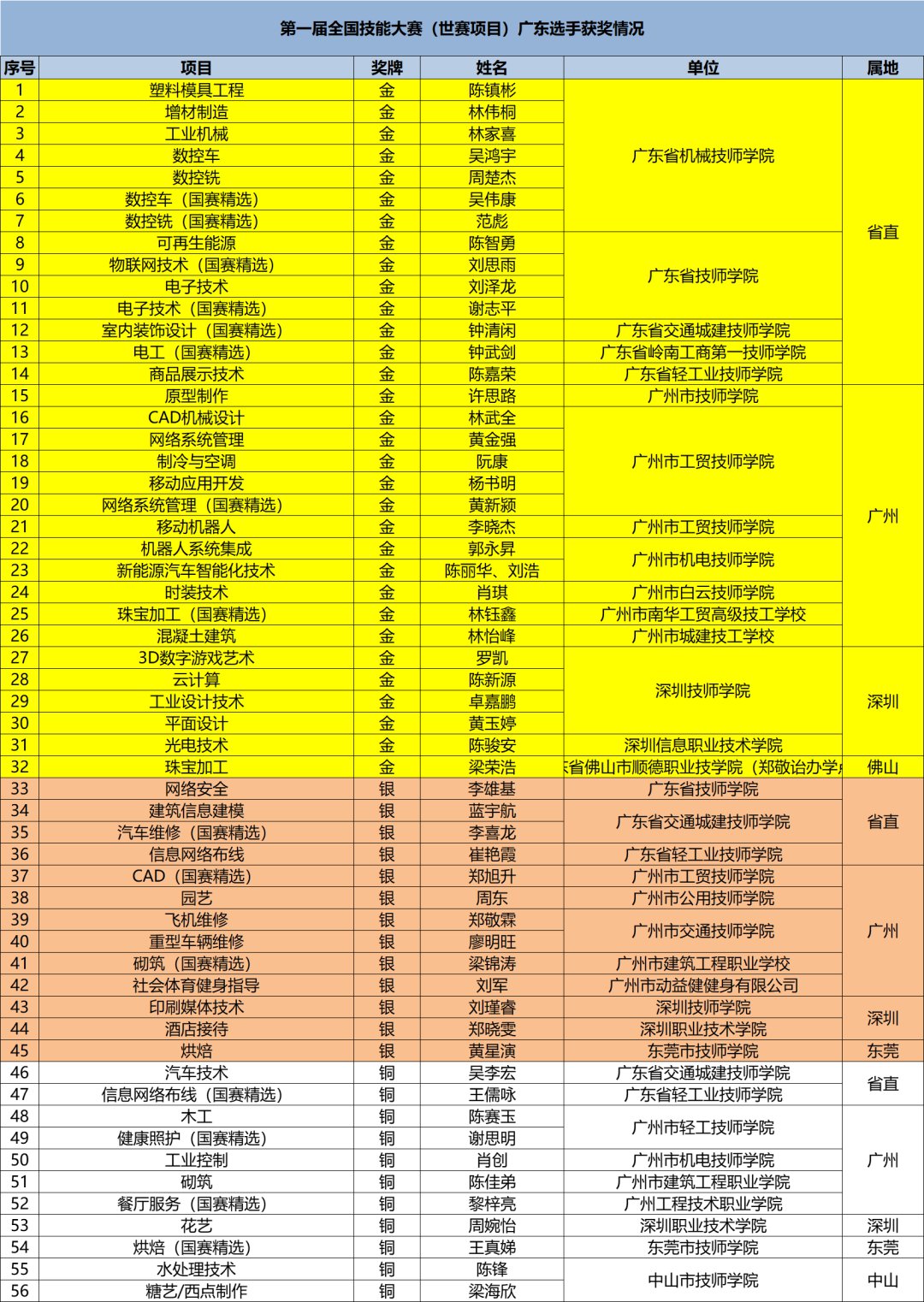 第一届全国技能大赛在广州顺利闭幕,广东代表团在大赛中,共获得32金、13银、11铜,金牌数占86个项目金牌总数近四成,是唯一一个金牌数超过20块的省份。