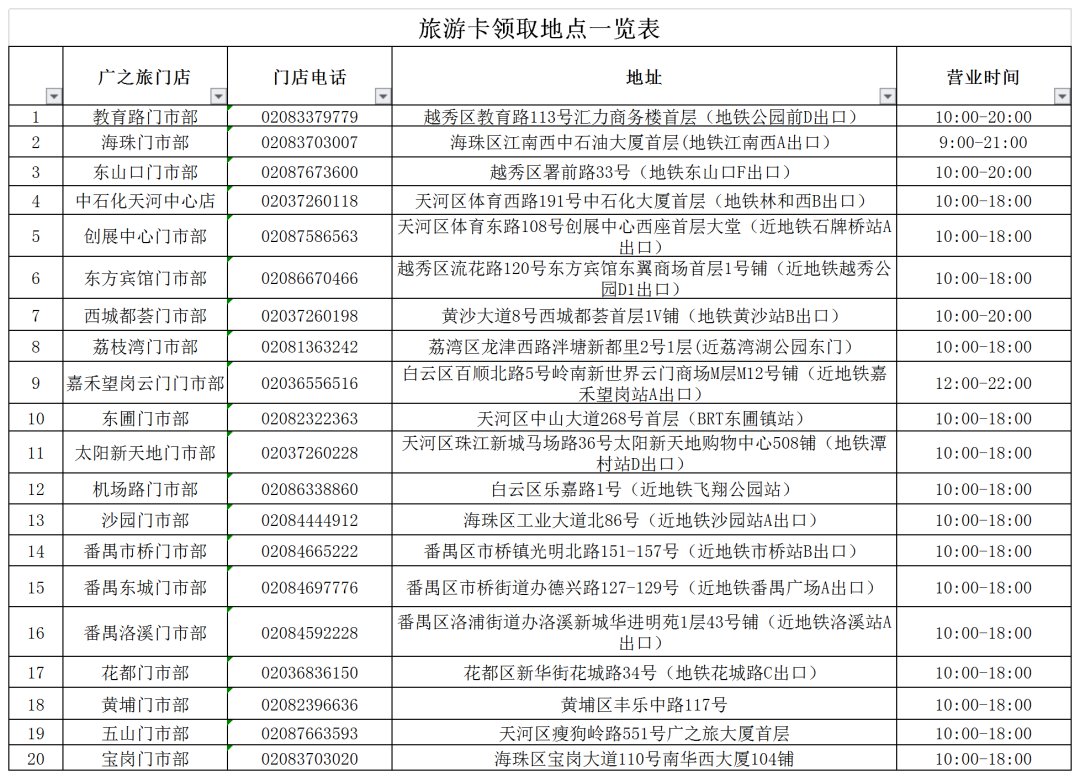 外地游客凭本人身份证、入住广州酒店的信息、48小时内抵达广州白云机场登机牌,即可在广之旅旗下20间门市店免费领取旅游卡。