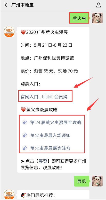 时间:8月21日-8月23日 地点:琶洲保利世贸博览馆5-6号馆 票价:预售票65元;现场票70元 小编提醒:搜索关注广州本地宝(ID:bdbguangzhou)微信公众号,在对话框回复【萤火虫】,即可获得第24届广州萤火虫漫展购票入口、最新资讯,还可以获得萤火虫漫展嘉宾阵容、入场须知、场馆地图等相关信息!更多相关信息正在持续更新中,敬请期待!
